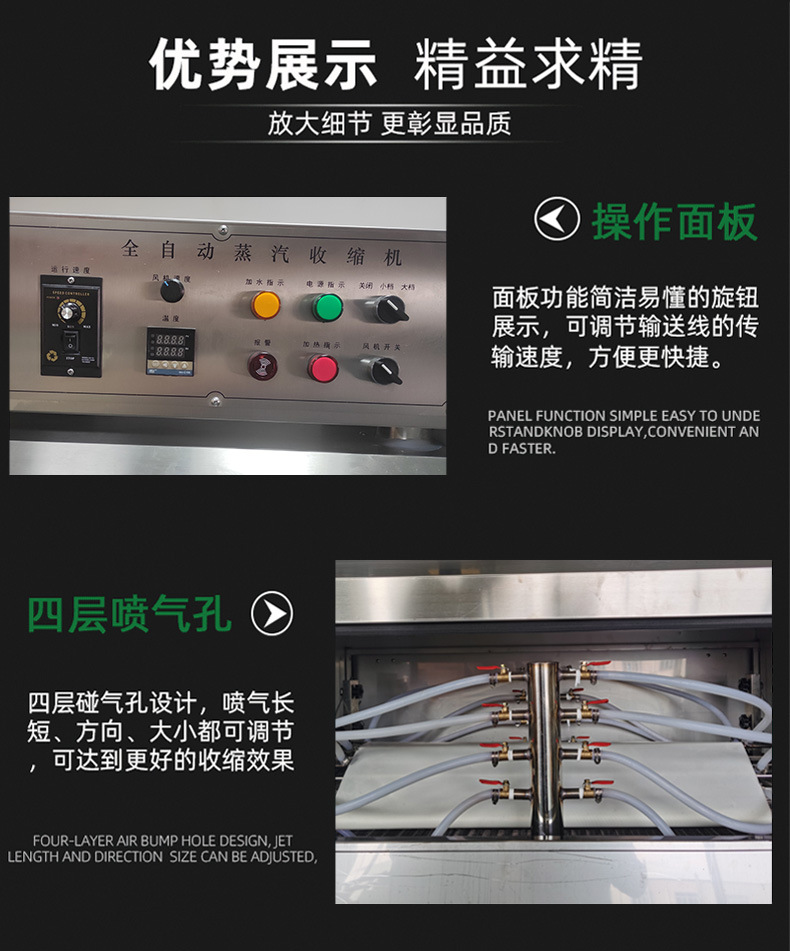 安全性高:配備溫度計及壓力表,使蒸汽壓力及收縮溫度一目了然,方便操作人員實時監(jiān)控和調整;蒸汽進氣閥門裝有刻度盤,節(jié)省每班操作開機時間的同時,也提高了操作的準確性和安全性;此外,部分設備還裝有漏電保護開關、缺水報警保護等裝置,進一步增強了設備的安全性.