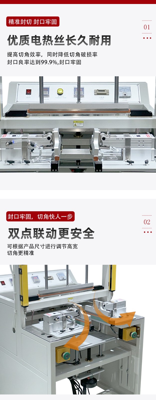 高效快捷:封口速度比傳統(tǒng)設(shè)備快,部分機(jī)型每分鐘可完成 50 次精準(zhǔn)封口,能有效提高生產(chǎn)效率。 操作簡便:通常采用一鍵啟動或腳踏開關(guān)控制,操作人員只需簡單培訓(xùn)即可上手操作。 封口質(zhì)量好:采用雙面加熱封口,壓合平整美觀,封口牢固,且封口長度、寬度等參數(shù)可根據(jù)需求調(diào)整。 適應(yīng)性強(qiáng):可適用于 PVC、PP、POF 等多種材質(zhì)的收縮膜,還能根據(jù)不同產(chǎn)品規(guī)格進(jìn)行調(diào)整,兼容多種尺寸的包裝材料。 安全性高:部分機(jī)型配備急停按鈕等安全裝置,且外觀設(shè)計(jì)圓潤,無棱角,可減少操作人員受傷的風(fēng)險(xiǎn)。 應(yīng)用場景 廣泛應(yīng)用于食品、化工、電子、醫(yī)藥、日化等行業(yè),可用于對各種產(chǎn)品的包裝材料進(jìn)行封口和切角處理,如食品包裝袋、日化用品包裝袋、電子產(chǎn)品包裝盒等的封裝。 代表產(chǎn)品 如中堡智能科技實(shí)業(yè)有限公司的HX-4018 智能氣動封口切角機(jī)、東莞博冠包裝實(shí)業(yè)有限公司的氣動封口切角機(jī)等,均具有運(yùn)行穩(wěn)定、包裝速度快、多規(guī)格適配等特點(diǎn)。