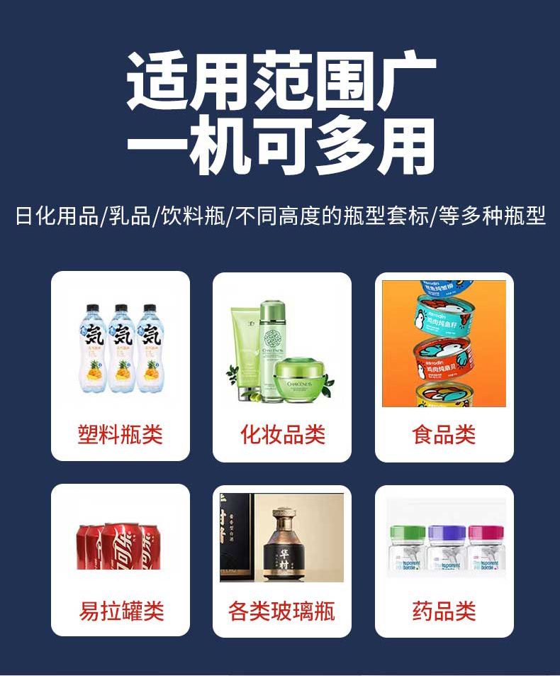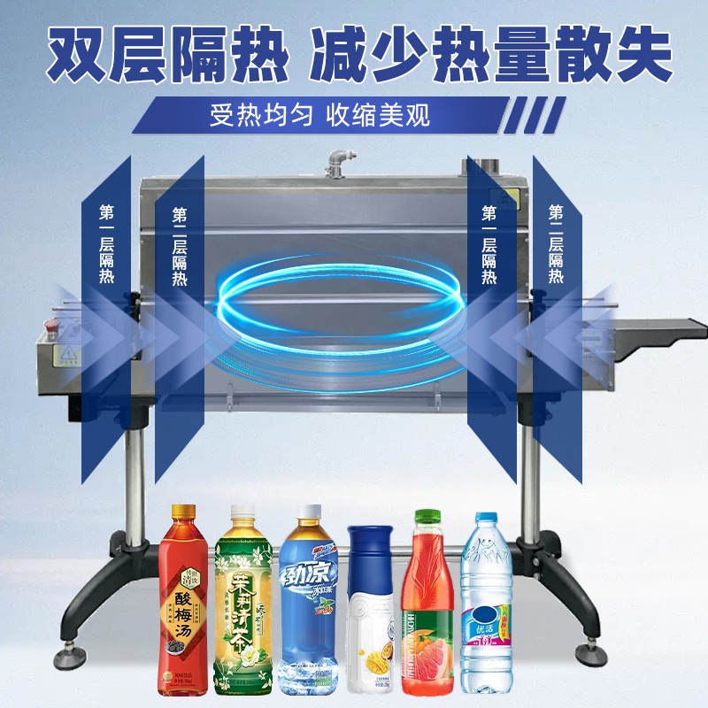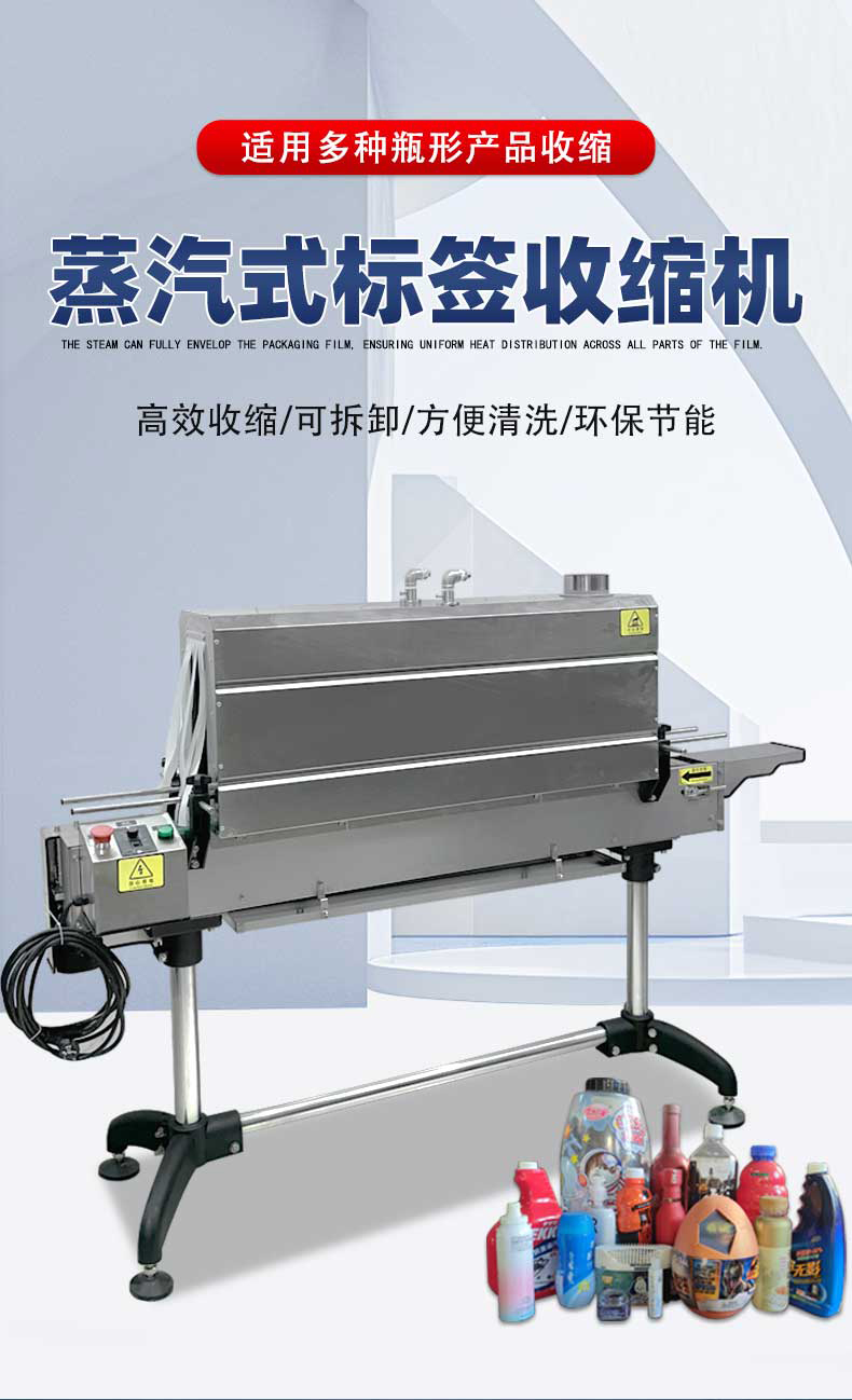 - 適配不同形狀產(chǎn)品:對于圓瓶類的飲料瓶、香水瓶,蒸汽可無死角環(huán)繞瓶身,讓收縮膜從頂部到底部勻速收縮,貼合瓶身曲線且無褶皺;針對方瓶類的化妝品禮盒、醬料瓶,蒸汽能均勻滲透到平面與棱角,收縮膜精準(zhǔn)嵌入邊角,使包裝方正挺括;就算是扁瓶類的酒壺、扁狀洗手液瓶,蒸汽也能適應(yīng)其特殊輪廓,讓收縮膜完美貼合,凸顯產(chǎn)品造型。