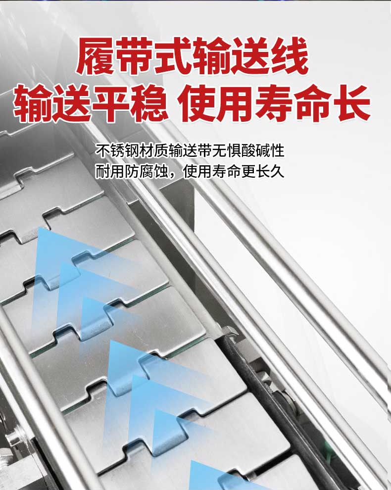 - 傳動系統(tǒng):采用網(wǎng)帶、鏈板或滾筒輸送產(chǎn)品,速度可變頻調(diào)節(jié),通常為 0.5-10m/min,以適應(yīng)不同產(chǎn)能需求。