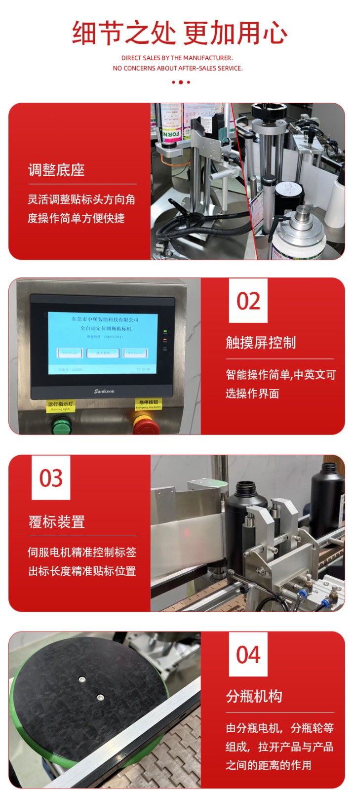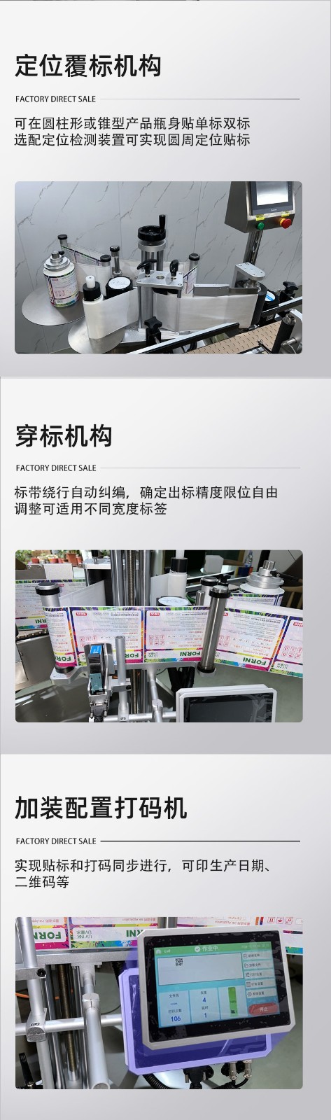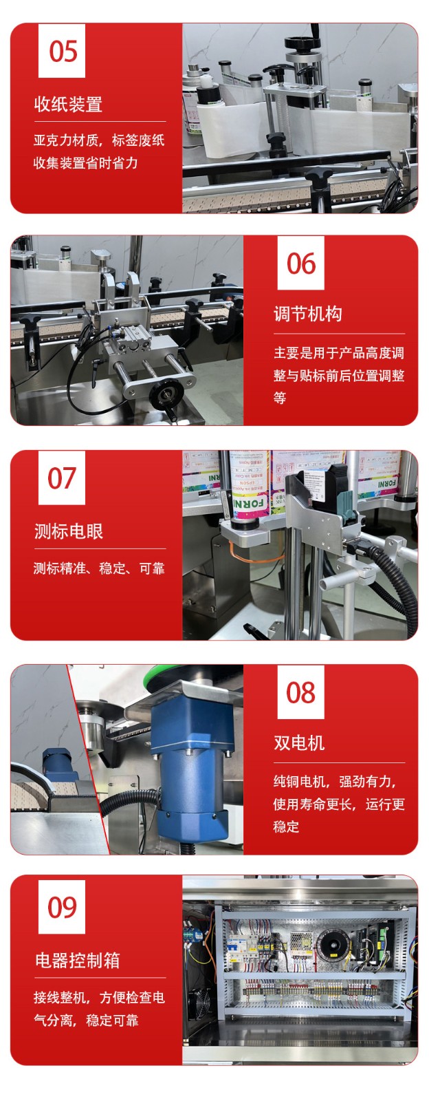 圓瓶類產(chǎn)品的貼標(biāo),可貼單標(biāo)和雙標(biāo),正背雙標(biāo)間距可靈活調(diào)整,部分機(jī)型還具備錐形瓶貼標(biāo)功能。精準(zhǔn)定位、高效智能、靈活兼容與合規(guī)耐用,可顯著提升產(chǎn)線自動化與貼標(biāo)良率。