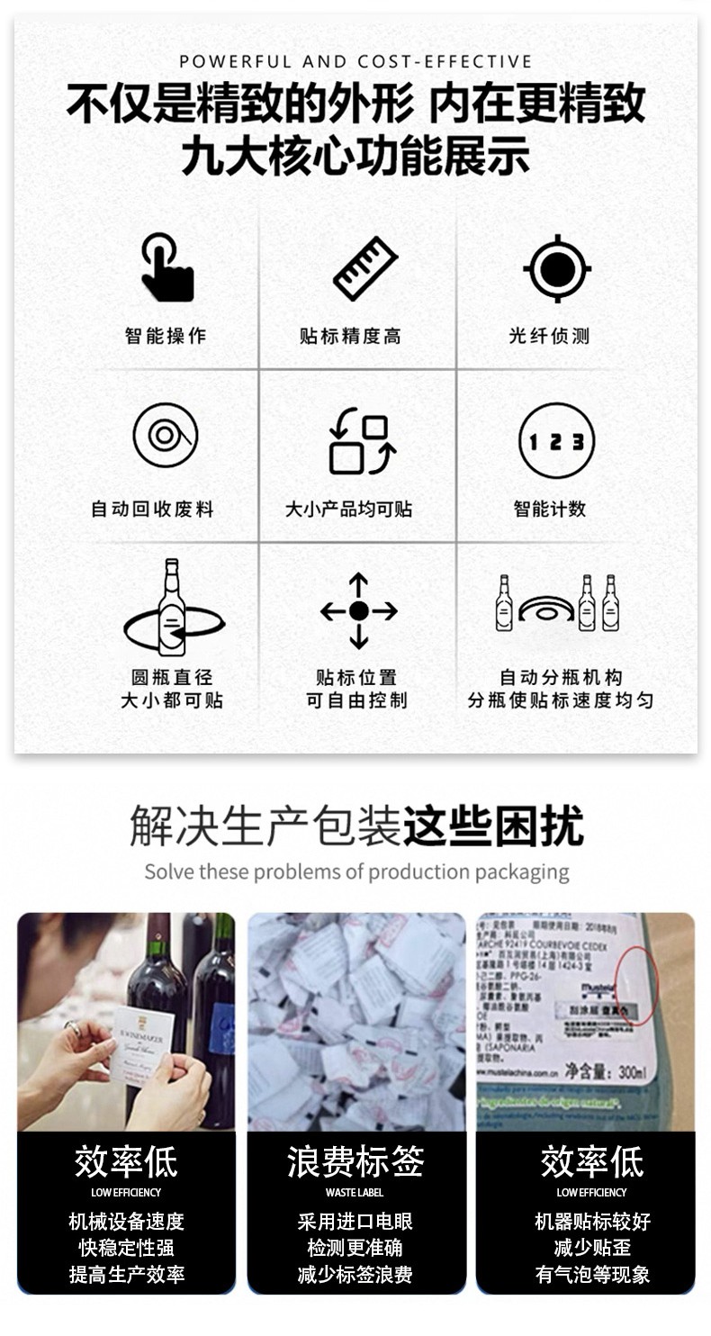 替代人工,降本提質(zhì):避免人工貼標(biāo)歪斜、起泡、效率低等問題,穩(wěn)定貼標(biāo)質(zhì)量,降低單位成本,提升產(chǎn)品包裝美觀度與競爭力。