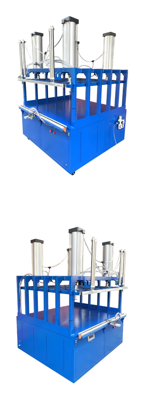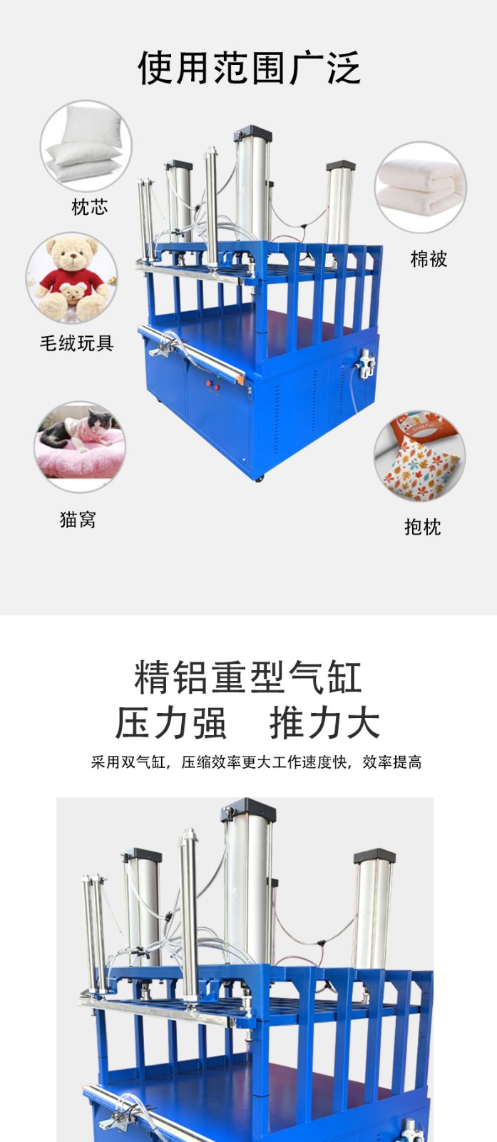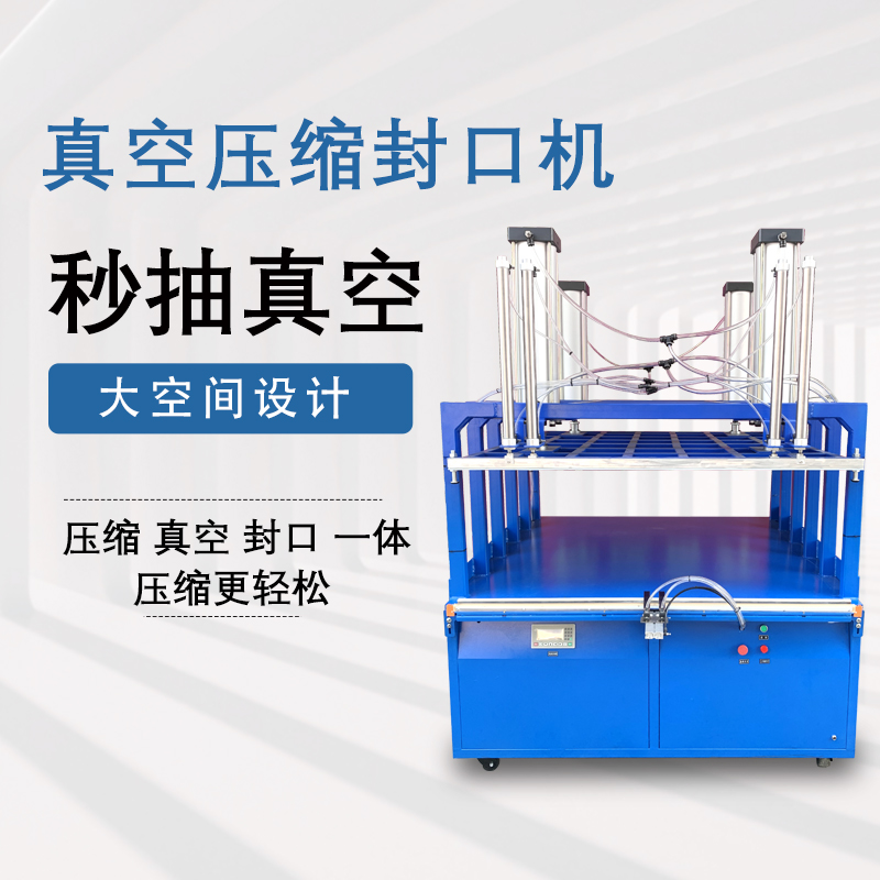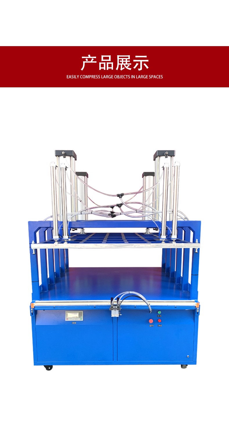 一般包括雙氣缸壓縮裝置、封口條、底板定位裝置等。雙氣缸提供強大壓力,確保壓縮效果;封口條隨上壓板升降,便于操作;底板定位裝置可將被包裝物壓成一定厚度,使包裝更勻稱。