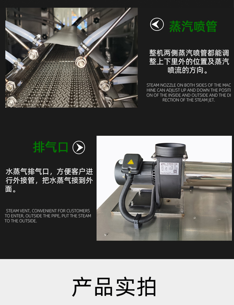 收縮階段:包裝好的產(chǎn)品接著被輸送到蒸汽收縮部分的收縮通道入口。此時,蒸汽發(fā)生系統(tǒng)已經(jīng)產(chǎn)生了合適的蒸汽,蒸汽通過噴頭均勻地噴灑在產(chǎn)品的包裝薄膜上。包裝薄膜在蒸汽的熱量作用下開始收縮,緊密貼合在產(chǎn)品表面。產(chǎn)品在輸送系統(tǒng)的推動下繼續(xù)在收縮通道內(nèi)移動,保證薄膜各個部分都能充分收縮。收縮完成后,通風口排出蒸汽,產(chǎn)品在外界環(huán)境下冷卻定型,最終完成蒸汽收縮包裝,從出口輸送帶送出一體機。